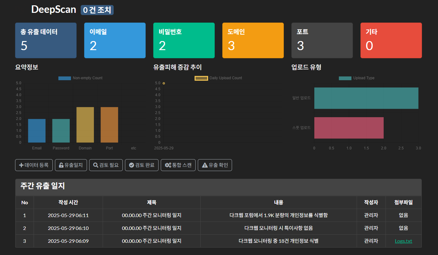 다크웹을 통한 개인정보 유출은 고객 신뢰에 심각한 영향을 미칠 수 있습니다. 이에 다크웹 상의 유출 정보를 선제적으로 탐지하고 체계적으로 관리할 수 있는 대시보드를 구축하고자 합니다.